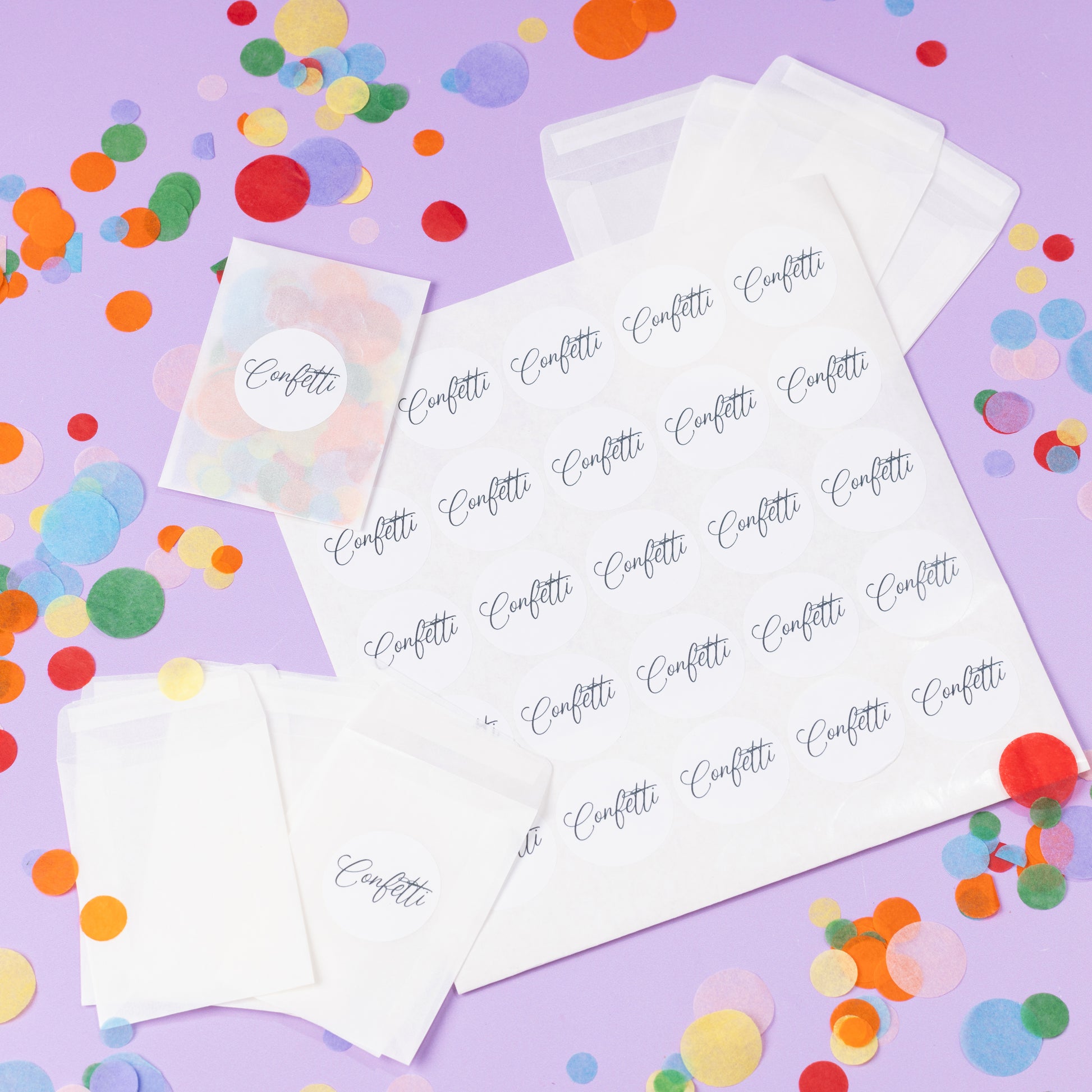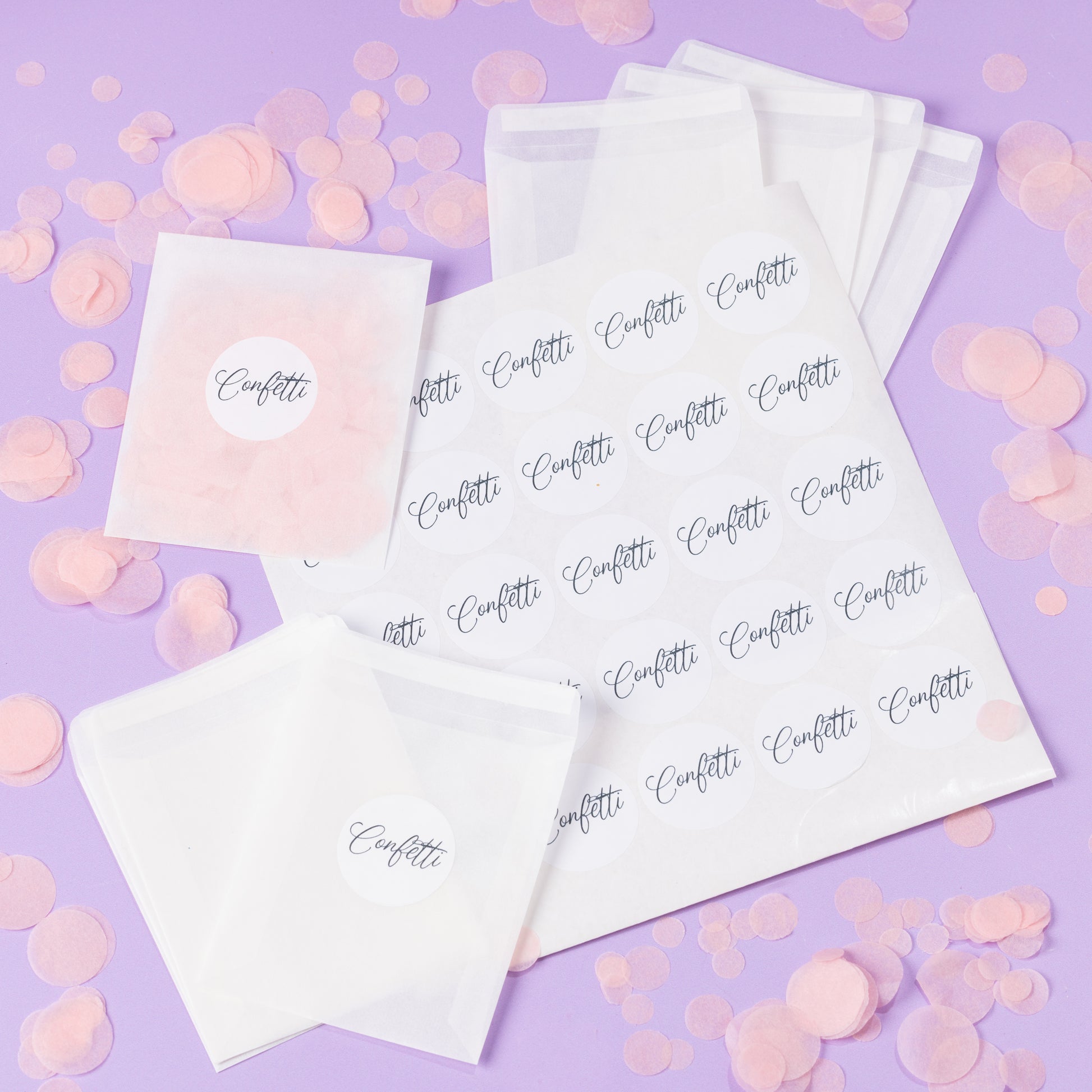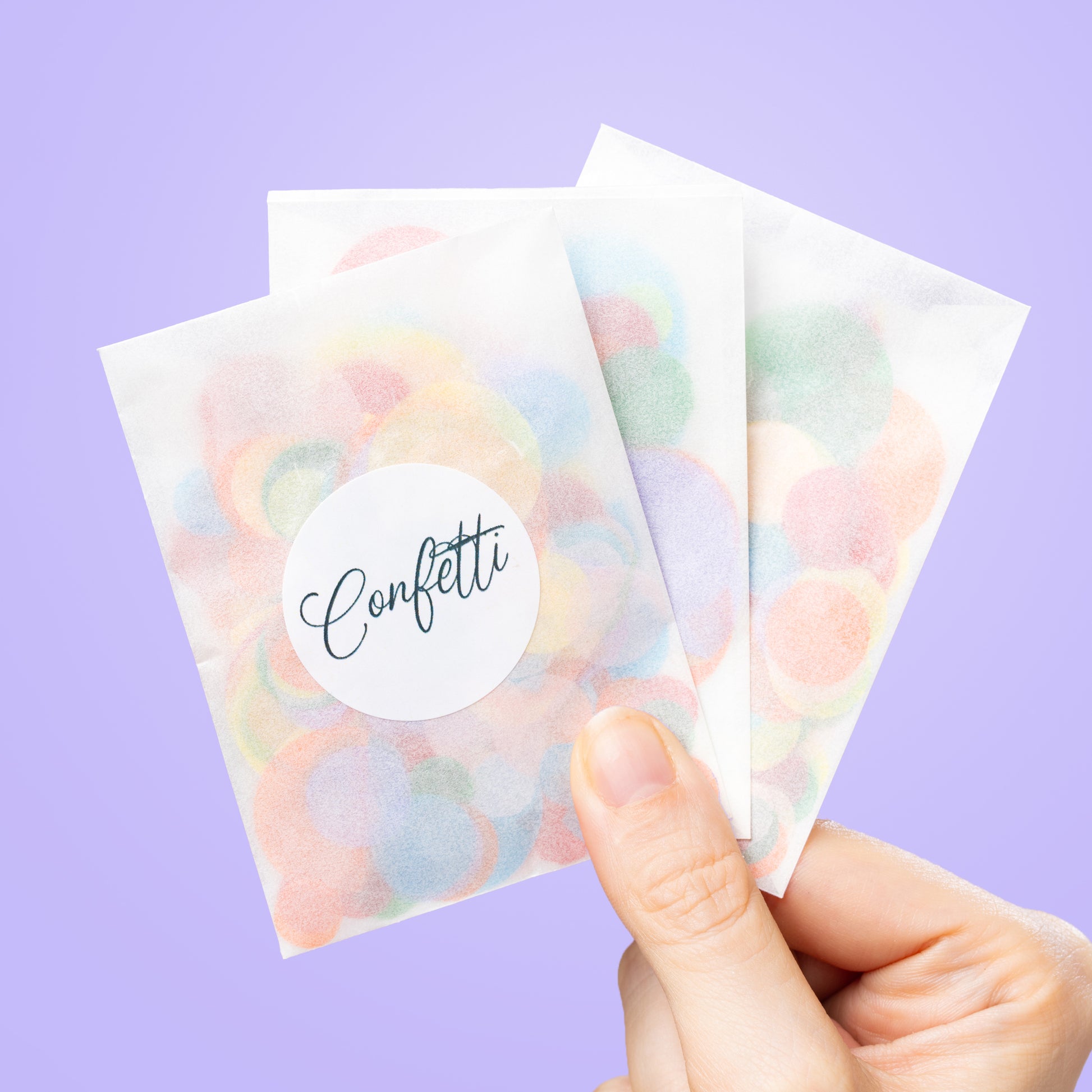 Our super dooper offer gives you 10 x Glassine bags, Biodegradable paper confetti and a Stickers.