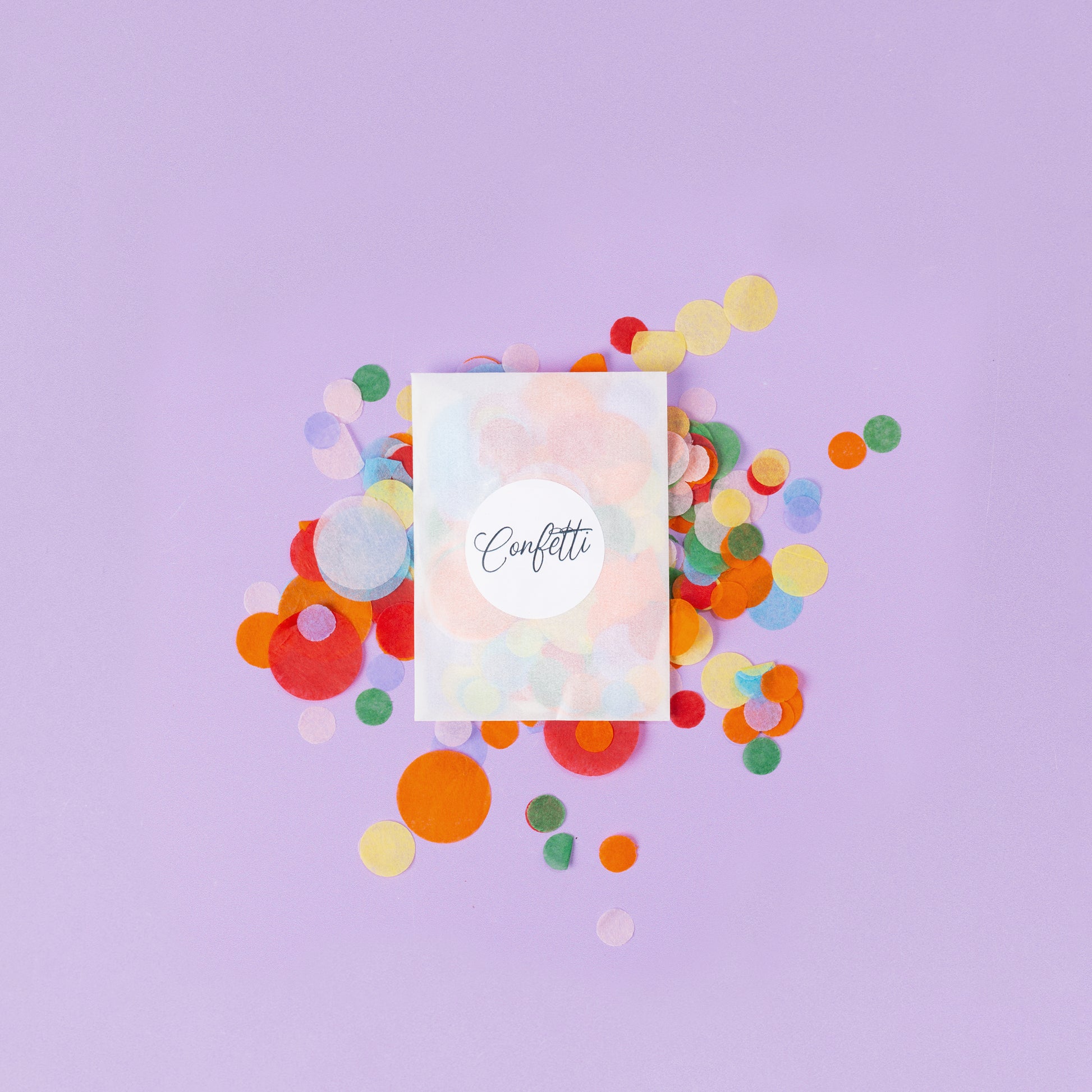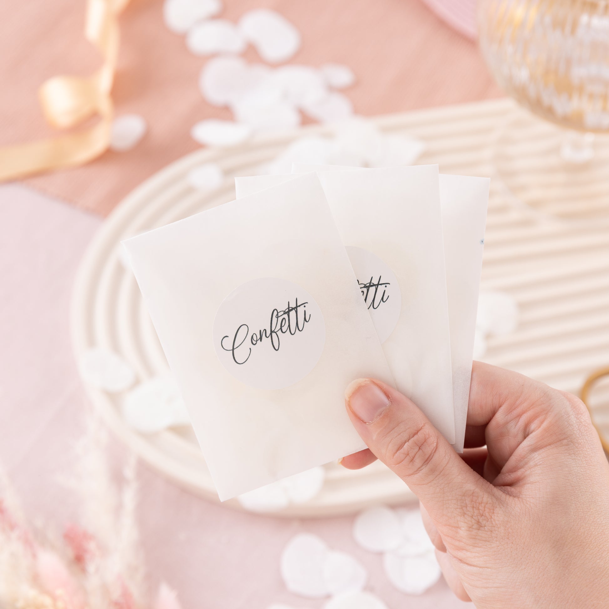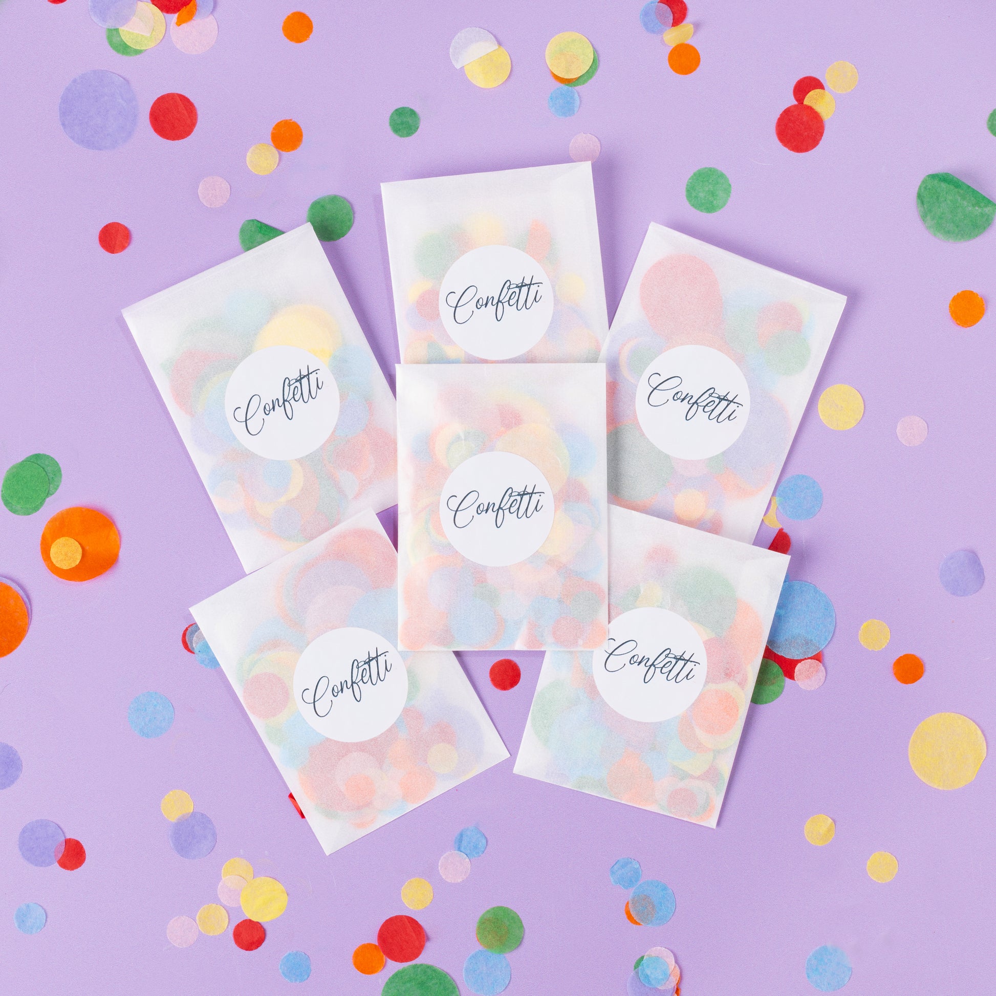 Our super dooper offer gives you 10 x Glassine bags, Biodegradable paper confetti and a Stickers.
